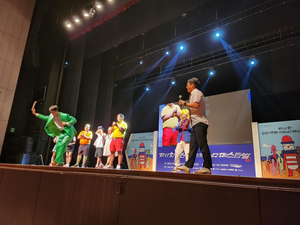 Nous sommes arrivées très en avance, les membres du staff distribuaient aux spectateurs des boissons caféinées avant de rentrer dans la salle (sponsor ? probablement, et on apprécie le geste, même si la pluie a rafraîchi, il fait toujours très chaud). Encore une fois, nous sommes placées au premier rang. N’ayant pas oublié la déconfiture de la veille, je demande brièvement s’il est possible d’être placée plus loin. Malheureusement, la séance étant complète, il faut attendre de voir si des places vont se libérer. La salle se remplit effectivement petit à petit. Pas un seul siège n’est laissé libre. L’audience est très jeune. C’est une grande majorité d’enfants qui sont là, les seuls adultes présents semblent seulement accompagner les plus jeunes. Nous n’avons pas la moindre idée de ce que nous sommes venues voir. Cela va être la grande découverte. Mais c’est un véritable plaisir de voir une salle remplie d’enfants comme cela. Leur excitation est palpable. En effet, Schoolfoodking est une chaîne Youtube, idole des enfants, suivie par plus de 1,42 million de personnes ! Leur succès est dû à une richesse de personnages uniques et son joyeux contenu autour de la vie scolaire. Le spectacle est monté similairement à leur vidéo en ligne, c’est une succession de courts sketchs auxquels s’ajoutent, spectacle vivant oblige, de très beaux moments d’échanges avec le public. Des jeux sont organisés entre plusieurs tableaux, parents comme enfants participent, les chanceux spectateurs se voient remettre des livres par les artistes et les plus chanceux peuvent également discuter avec leurs idoles et prendre des photos. Les artistes se montrent (même sur scène et en plein spectacle) très disponibles. Les sketchs se succèdent, la fin du show approche, les artistes font chanter les enfants et font reprendre une chorégraphie à l’ensemble du public avant de se mêler à eux pour chanter et danser ensemble. Le spectacle a été plutôt relativement facile à suivre. La salle se vide rapidement, les artistes prennent quelques photos avec l’équipe du festival pour immortaliser l’instant. Le hall du théâtre est absolument noir de monde, les spectateurs se mettent en rangs pour pouvoir faire des photos avec les artistes et obtenir leur dédicace.