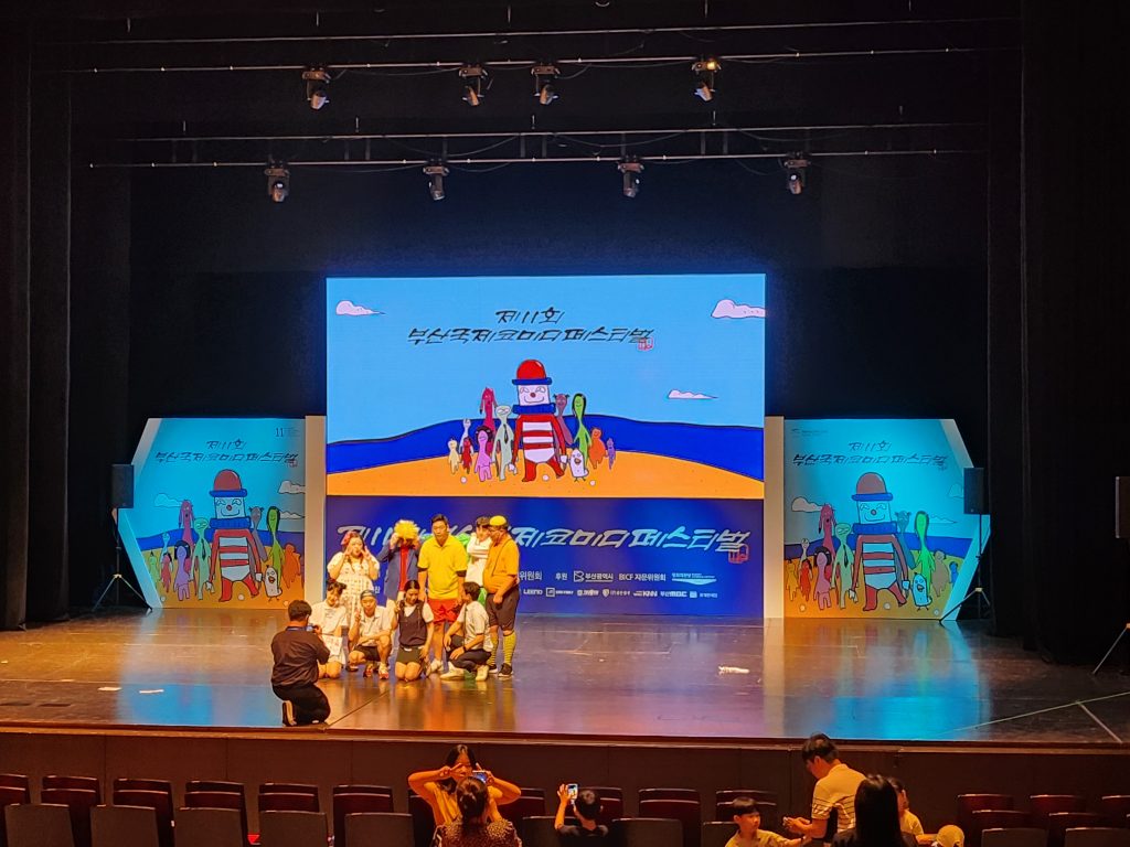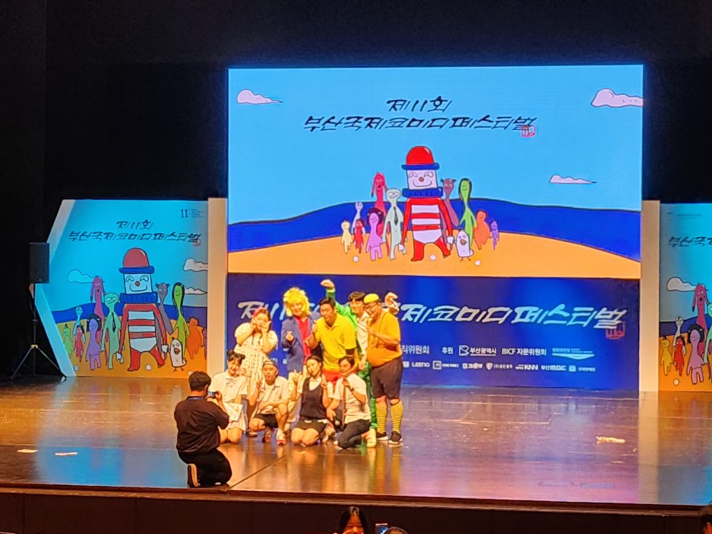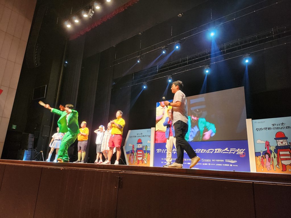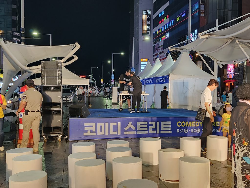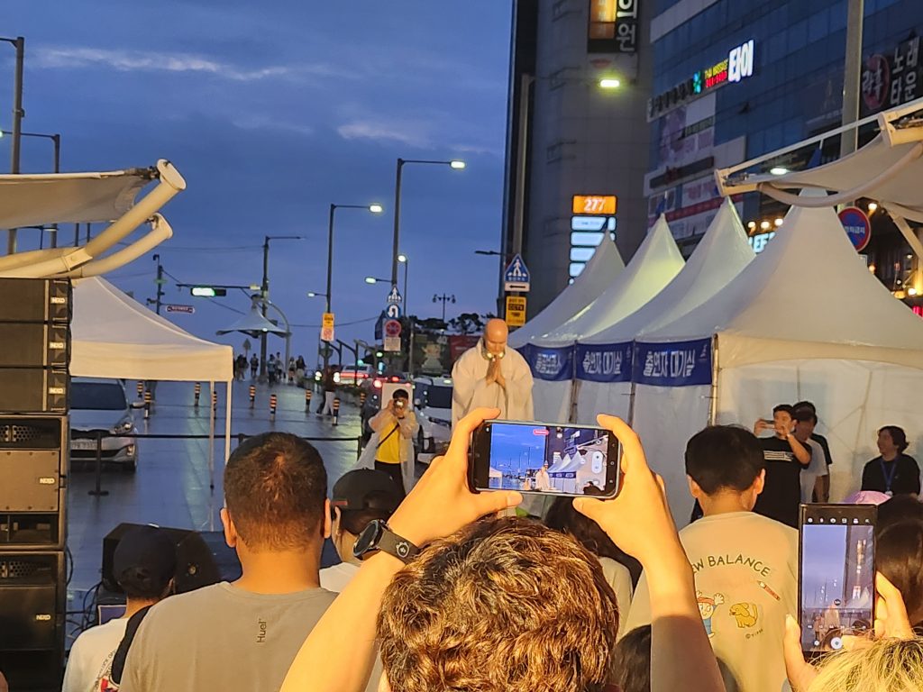Nous sortons rapidement pour rejoindre notre dernier point de rendez-vous. Pendant le précédent spectacle, la pluie s’est invitée sur le festival, un certain nombre de spectacles, petites formes de cirque, magie, jonglages, devaient se jouer dans l’espace urbain pour la dernière du Comedy Street à Haundae gunam-ro. Malheureusement, la plupart des shows prévus n’ont pas pu être maintenus. La programmation a cependant repris (et s’est terminée) avec un set de DJ Pakou, qui sous son apparence tranquille de moine bouddhiste a enchanté Haundae gunam-ro. J’ai vu la foule se réunir, s’agrandir, danser, chanter au son des platines du DJ. Le plus impressionnant était probablement la mixité générationnelle de l’audience. Le public coréen aime s’amuser simplement.