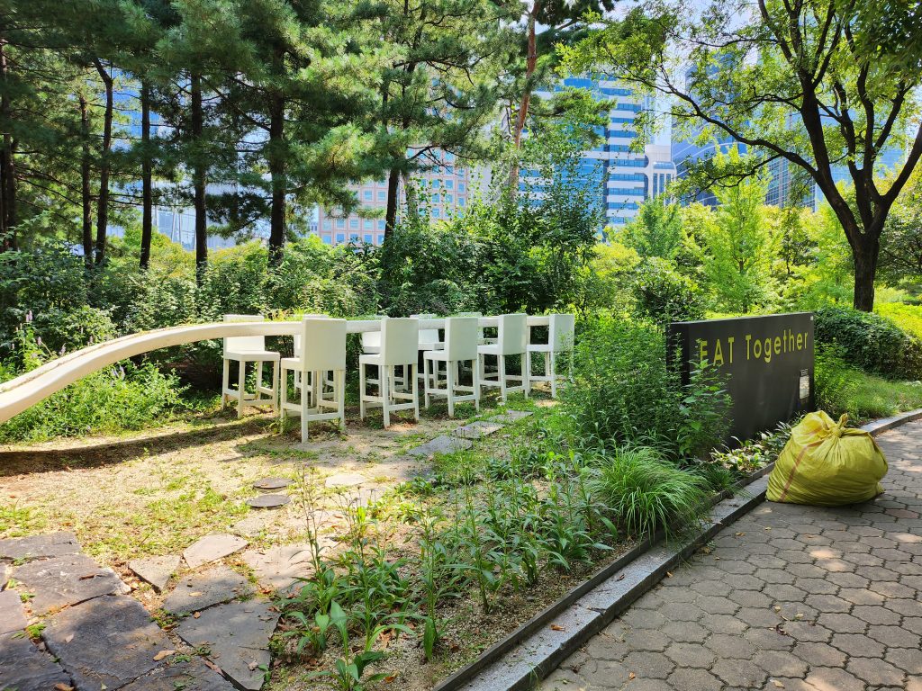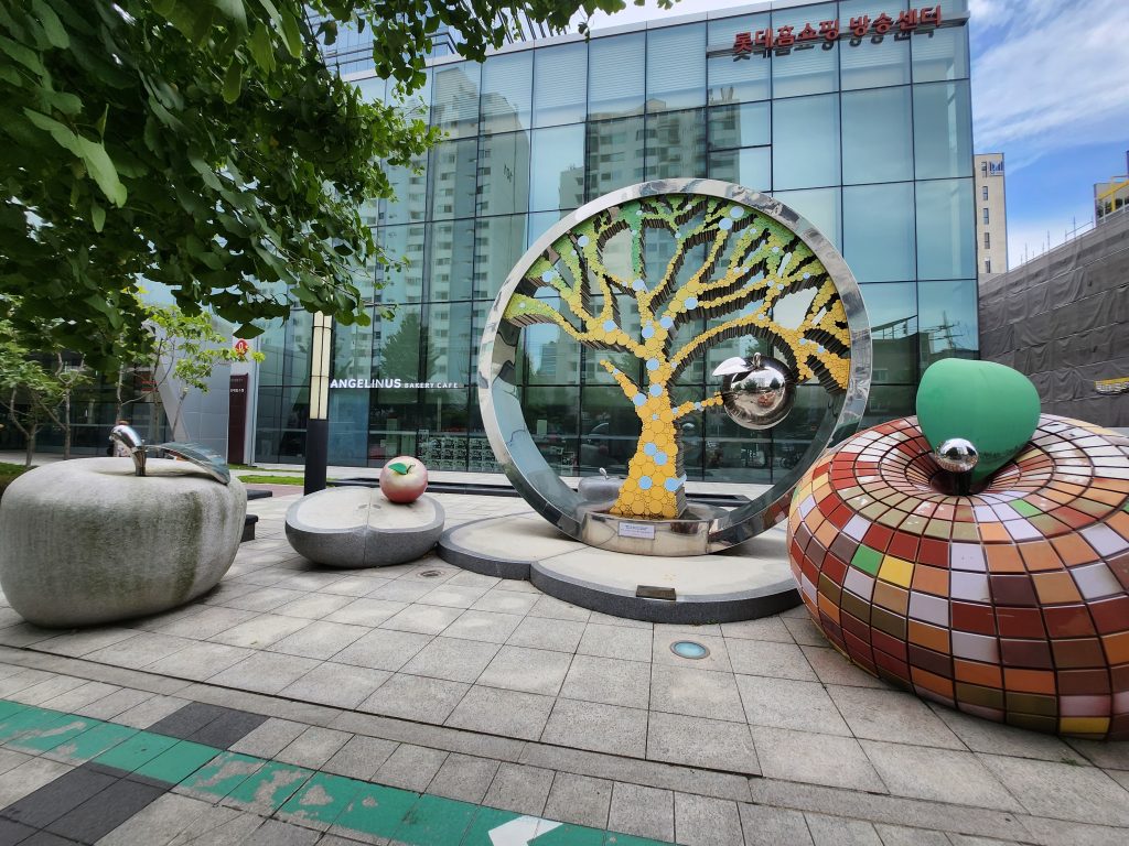 Cet étalement urbain est cependant une belle opportunité (malgré l’indifférence) de se confronter pour la première fois à l’art. Nous nous permettons de l’écrire, en raison de la façon de vivre des Coréens (tout du moins à Séoul), ils se lèvent très tôt mais se couchent très tard et passent beaucoup de temps dehors, adultes comme enfants. Nous constatons justement que les enfants sont nombreux dans les parcs, s’intéressant aux sculptures pour ne serait-ce que jouer autour, nous les entendons questionner leurs parents et nous pensons définitivement que nous voulons penser notre projet pour eux, pour qu’à l’âge adulte ils continuent d’être interpellés par ce qui les entoure.