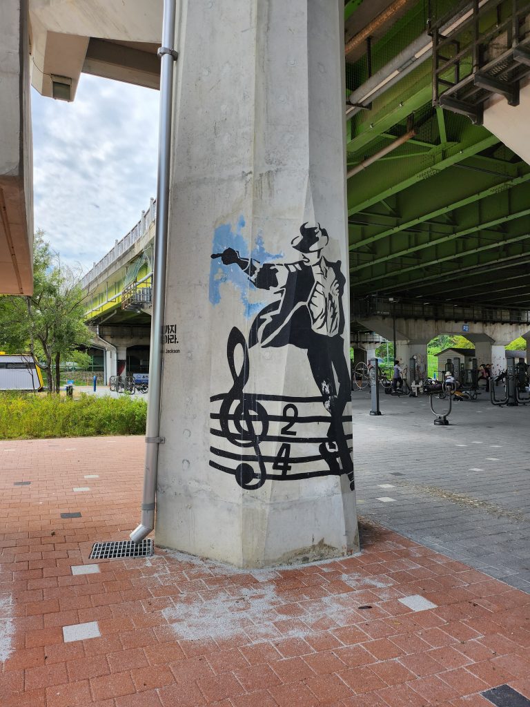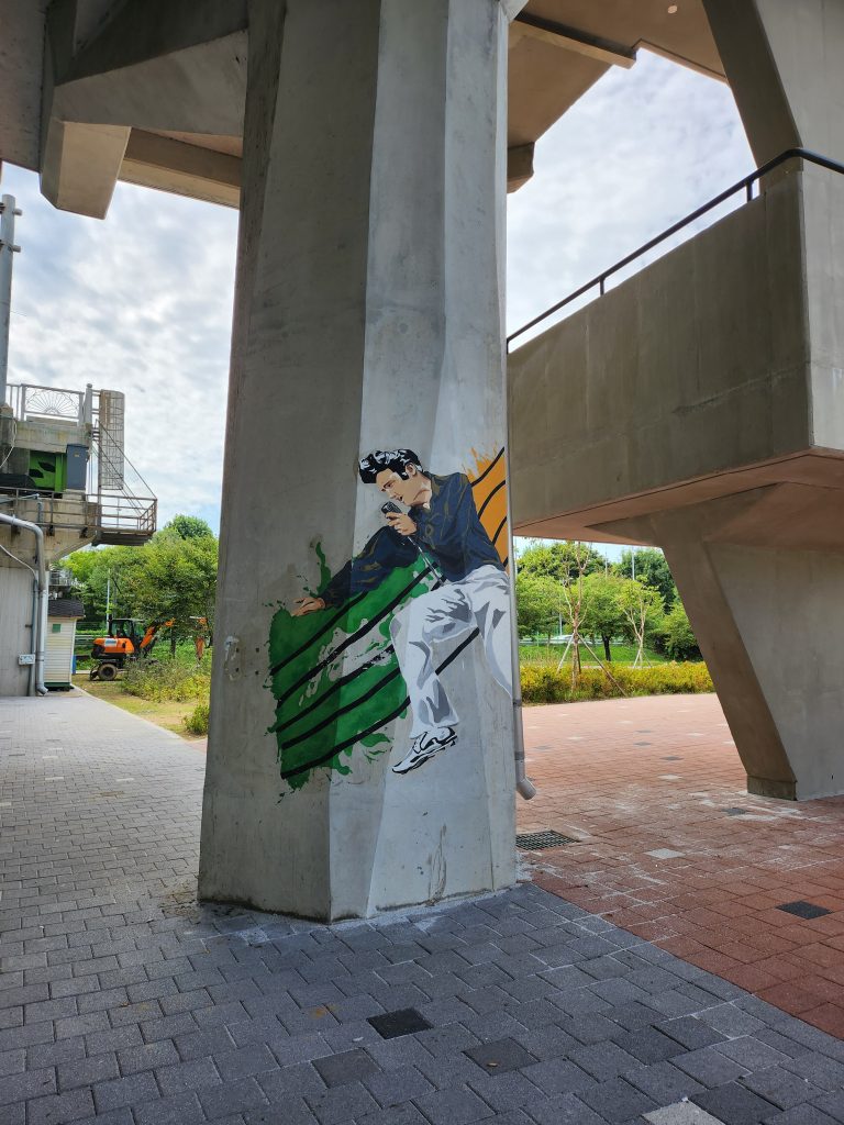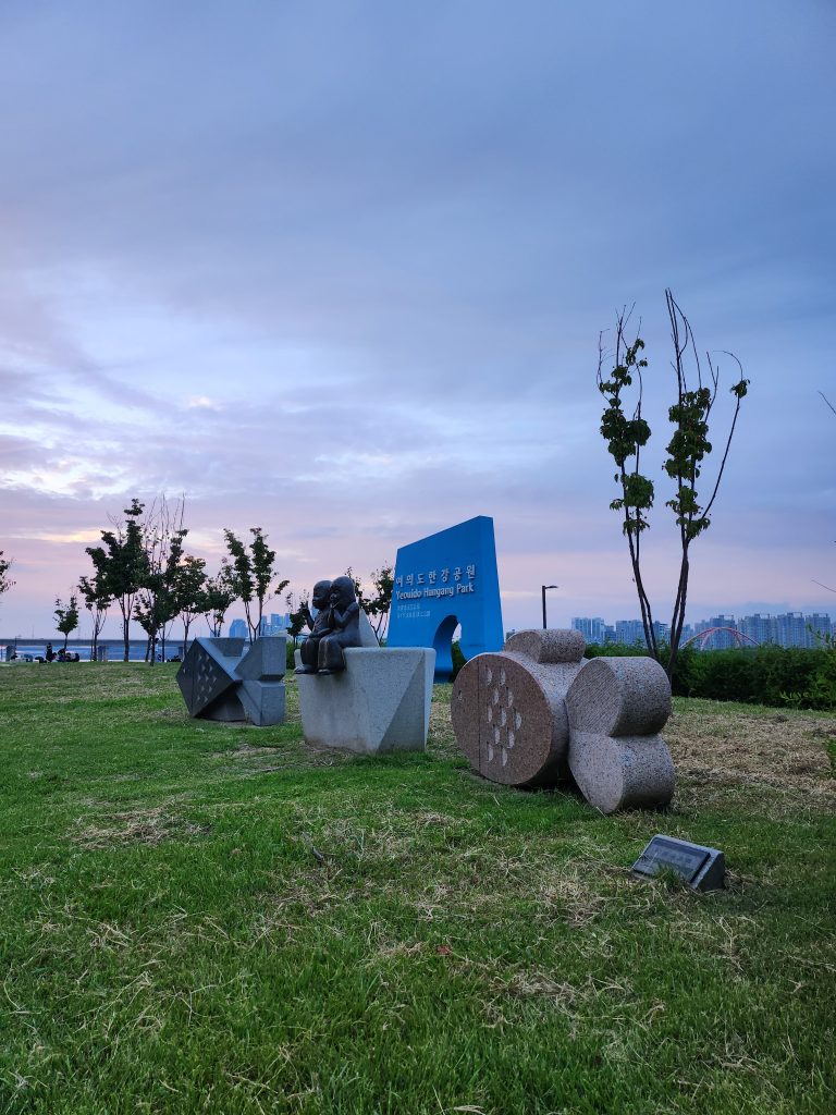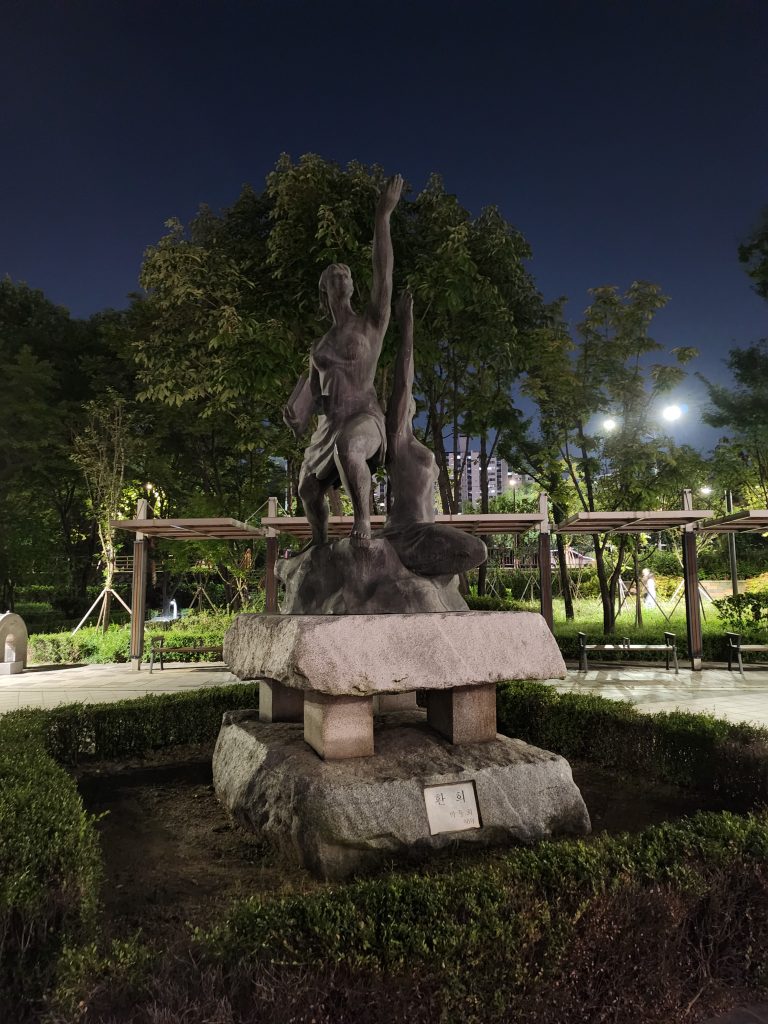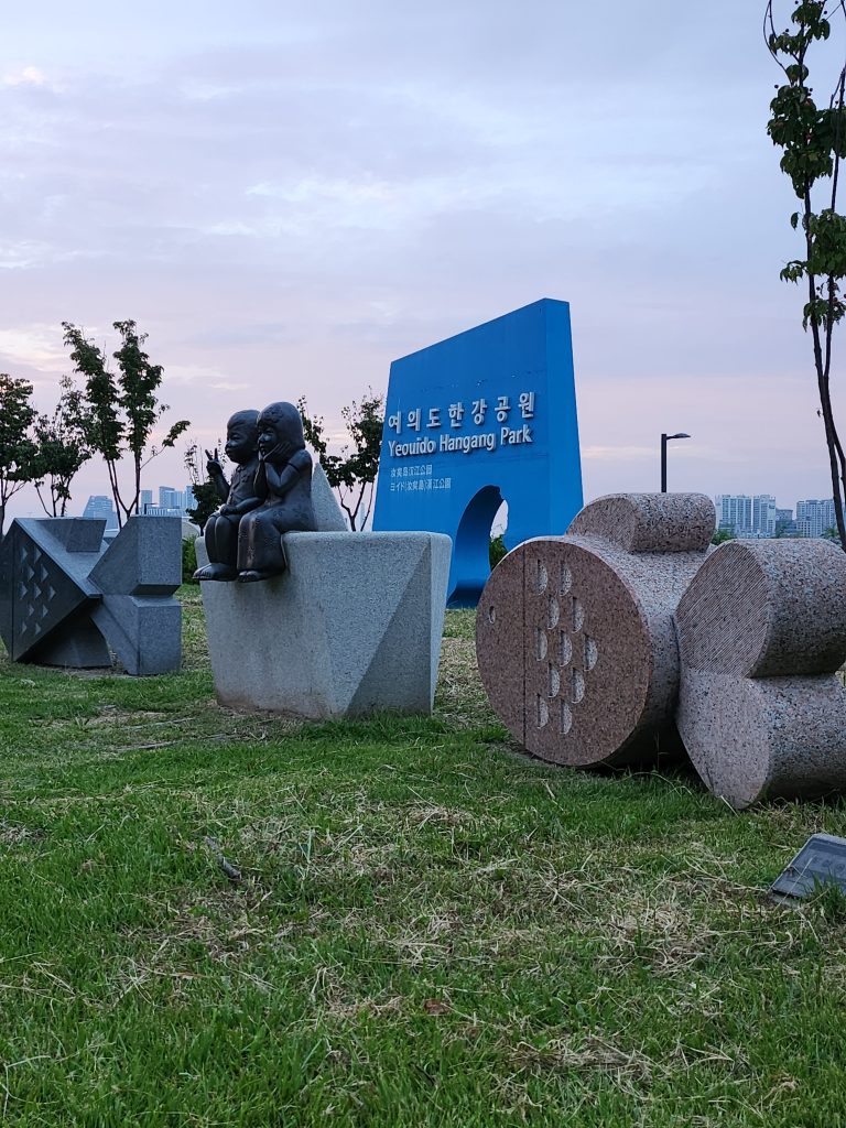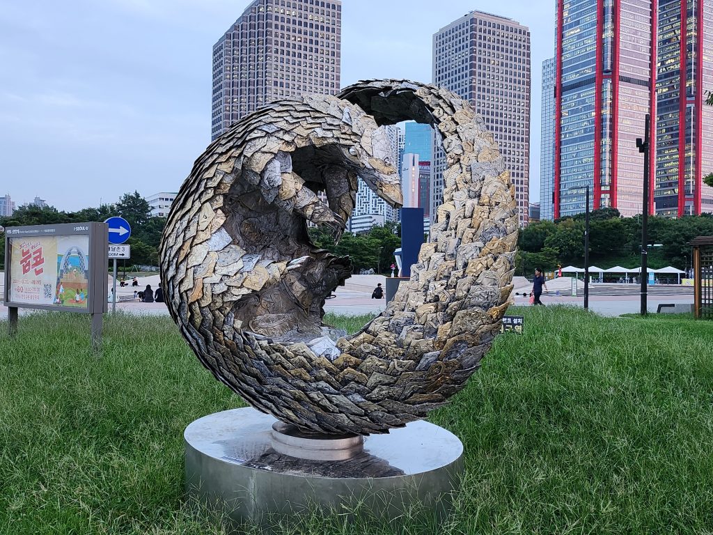 Nous l’avons retrouvé à Yeouido Park justement, où plusieurs sculptures sont à découvrir dans le paysage, au milieu des arbres. Ce parc est vraiment intéressant par sa richesse et diversité culturelle, où l’histoire moderne côtoie l’histoire fictive, où l’art traditionnel rencontre l’art contemporain. Yeouido Park est un havre de paix au milieu des immenses buildings, symbole de la dualité de ce pays. Quand vous décidez de monter un projet à l’étranger, ou tout du moins vous envisagez ce pari, pour réussir cette mission, il nous paraissait primordial de comprendre le mode de vie, de s’immerger complètement, d’étudier, d’observer les comportements sociaux. Très vite nous avons su que nous avions pris la bonne décision. La Corée du Sud est un pays qui change et évolue à une vitesse excessive, tout en restant fidèle à ses traditions et n’hésite pas à s’emparer aussitôt de toutes les nouveautés qui arrivent. Nous avions souvent l’impression en France d’un certain côté réfractaire à tout changement, d’une certaine peur, méfiance, envers les innovations. Et surtout, nous avions l’étrange sensation que ce qui est populaire ne doit pas se mélanger à ce qui est élitiste. Or, ici, tout semble être au même niveau – attention, nous avions bien conscience de l’effet pervers de cette phrase et nous ne cherchons pas à tendre vers le bas, bien au contraire, nous mettons simplement en avant qu’il n’y a ici pas de différences effectuées par les Coréens (a priori) entre les différents arts mais plutôt une absence de jugements, ils célèbrent avant tout toute vision artistique d’où qu’elle vienne.