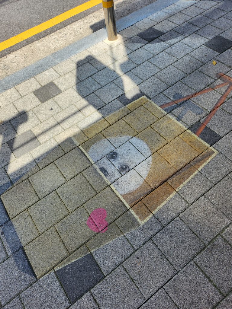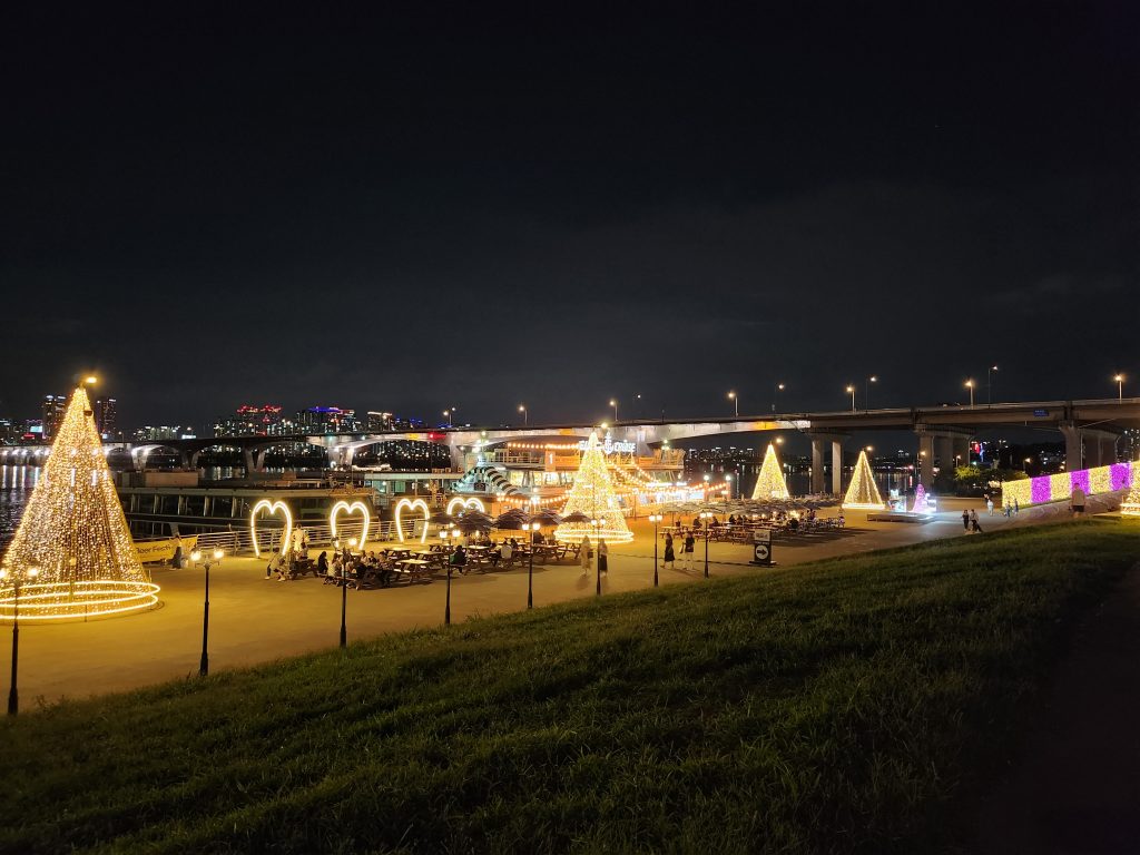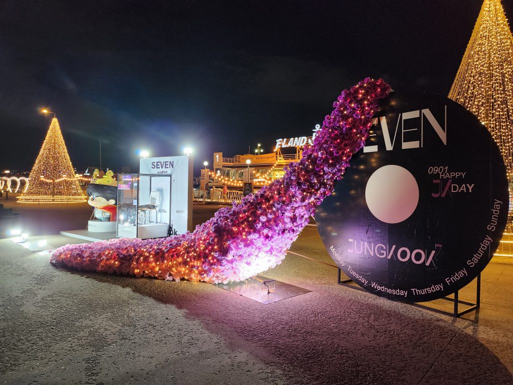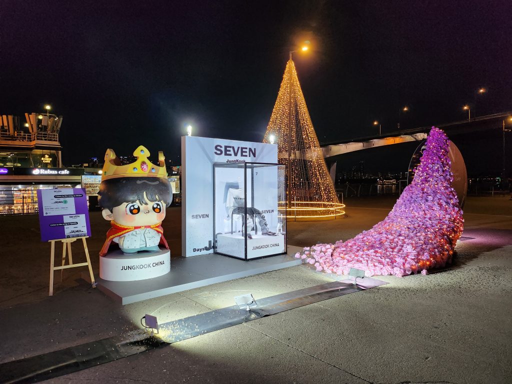 Nous parlions un peu plus tôt de la façon dont la population célèbre finalement toute forme d’art, ou de réussite. Nous sommes revenus ce soir-là jusqu’à notre logement en longeant la rivière Han et en traversant les différents parcs sur le chemin. Les gens sont dehors, il fait chaud, les berges sont dynamiques, au loin nous apercevons une zone plus animée, bruyante et lumineuse que les autres. Nous nous rapprochons et voyons une installation composée notamment d’une pop-up géante et d’un arbre lumineux pour célébrer la sortie et le succès mondial du single d’un artiste coréen, JungKook de BTS. Petits, ados, adultes, filles, garçons, prennent des photos, des selfies devant pour commémorer cet instant. Oublions le côté « star de la K-Pop » et artiste déjà populaire, la Corée célèbre avant tout la réussite d’un de ses artistes. Nous découvrons ici que les fans d’un artiste (quel qu’il soit – chanteur, acteur, confirmé, débutant, etc.) organisent de multiples événements pour de multiples occasions (anniversaires de naissance, de début, de sortie d’album, etc.). C’est un bel exemple pour nous de la ferveur coréenne. Il n’est pas rare de voir les fans louer des panneaux publicitaires dans le métro, des bus, des cafés pour célébrer leurs artistes. Cela nous fascine de voir une telle dévotion.